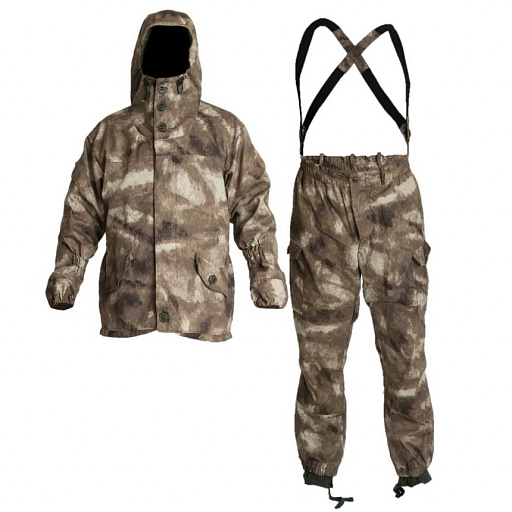Костюм свободного кроя состоящий из: куртки, брюк и подтяжек. Крепление пуговиц усилено киперной лентой, 11 карманов, капюшон с козырьком, низ рукавов и брюк на резинке, брюки на резинке со шлевками, пыльники с завязками, пристегивающиеся подтяжки из резинки на пуговицах. Регулируемый капюшон с козырьком и утяжкой с фиксатором. Застежки-пуговицы для надежности крепления пропущены через киперную ленту. Два кармана с клапаном на пуговицах внизу. На каждом рукаве по одному карману, с клапаном на липучке. Внутренний карман из основной ткани (на пуговице). Манжеты рукавов стягиваются резинкой. Утяжка по низу куртки. Утеплитель Polar Fleece 180 гр/м2 с внутренней стороны. Брюки с широким поясом на резинке с шлевками под ремень. Два кармана сзади закрыты клапаном на пуговице. Два прорезных кармана сбоку, два накладных объемных сбоку по низу брючины с клапаном на пуговице. Брюки имеют отстегивающиеся подтяжки из резинки. Регулировка ширины низа брюк за счет резинки. Внутри по низу вставка из ткани бязь (100% х/б). Резинка в области голени для наилучшего прилегания к ноге.