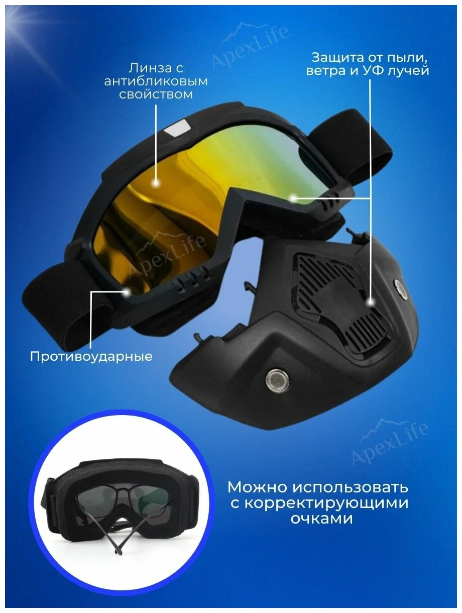 Очки-маска предназначены для горнолыжного, мото и вело спорта, их так же можно использовать для занятий активными и экстремальными видами спорта: сноуборда, скейтборда, квадроцикла, снегохода. Линзы маски обладают отличным обзором и хорошей защитой от солнечных бликов, грязи, снега. Оправа вентилируемая. Наличие вспененного уплотнителя обеспечивает максимальное прилегание маски и защиту глаз от попадания пыли. Нижняя часть маски съемная. Длина ремешка регулируется, что позволяет использовать маску как самостоятельно, так и с большинством видов шлемов.